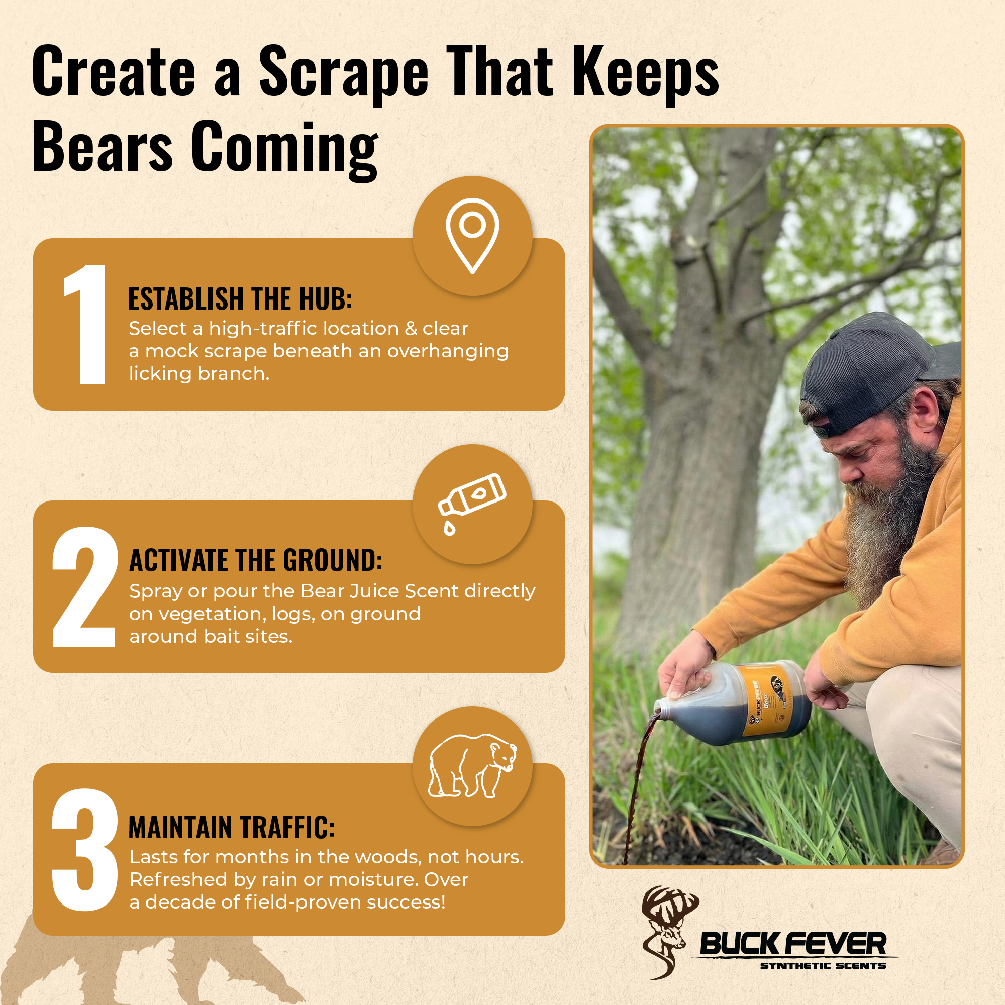Directions: Bear Juice should be applied as a fine mist via sprayer on vegetation, logs, on ground around bait sites. Scent is designed to carry long distances with the slightest breeze. Lasts for months in the woods, not hours. Refreshed by rain or moisture. Over a decade of field-proven success!